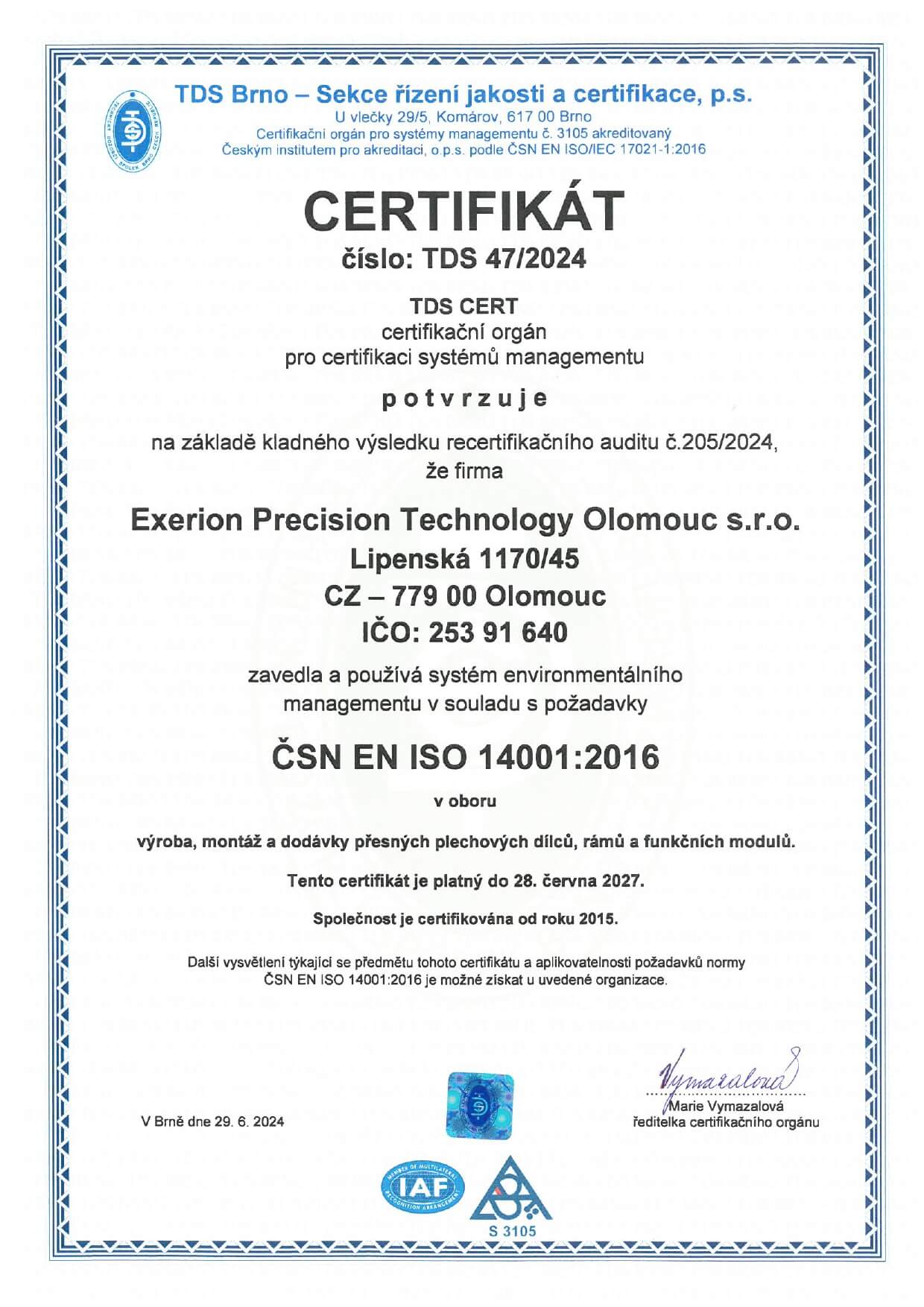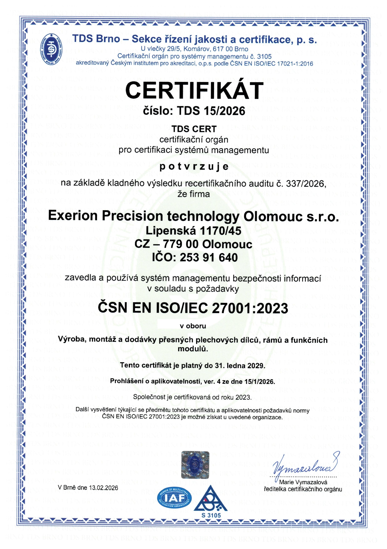 Management kvality je základním aspektem výrobního a obchodního procesu naší firmy, který začíná technologickým vývojem zajištěným mateřskou společností Exerion Precision Technology Ulft. Firma se snaží být zákazníkovi co nejblíže a neustále s ním spolupracovat na inovacích vyráběných produktů s cílem zvýšit funkčnost a snížit náklady.